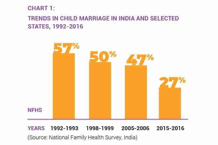 According to National Family Health Survey (NFHS) data (see chart below), the prevalence of child marriage in India has seen a decline in the past decades, from 57 percent in 1992-93 to 27 percent in 2015-16. But, a quarter of India’s child population, persons under the age of 18, are still affected.